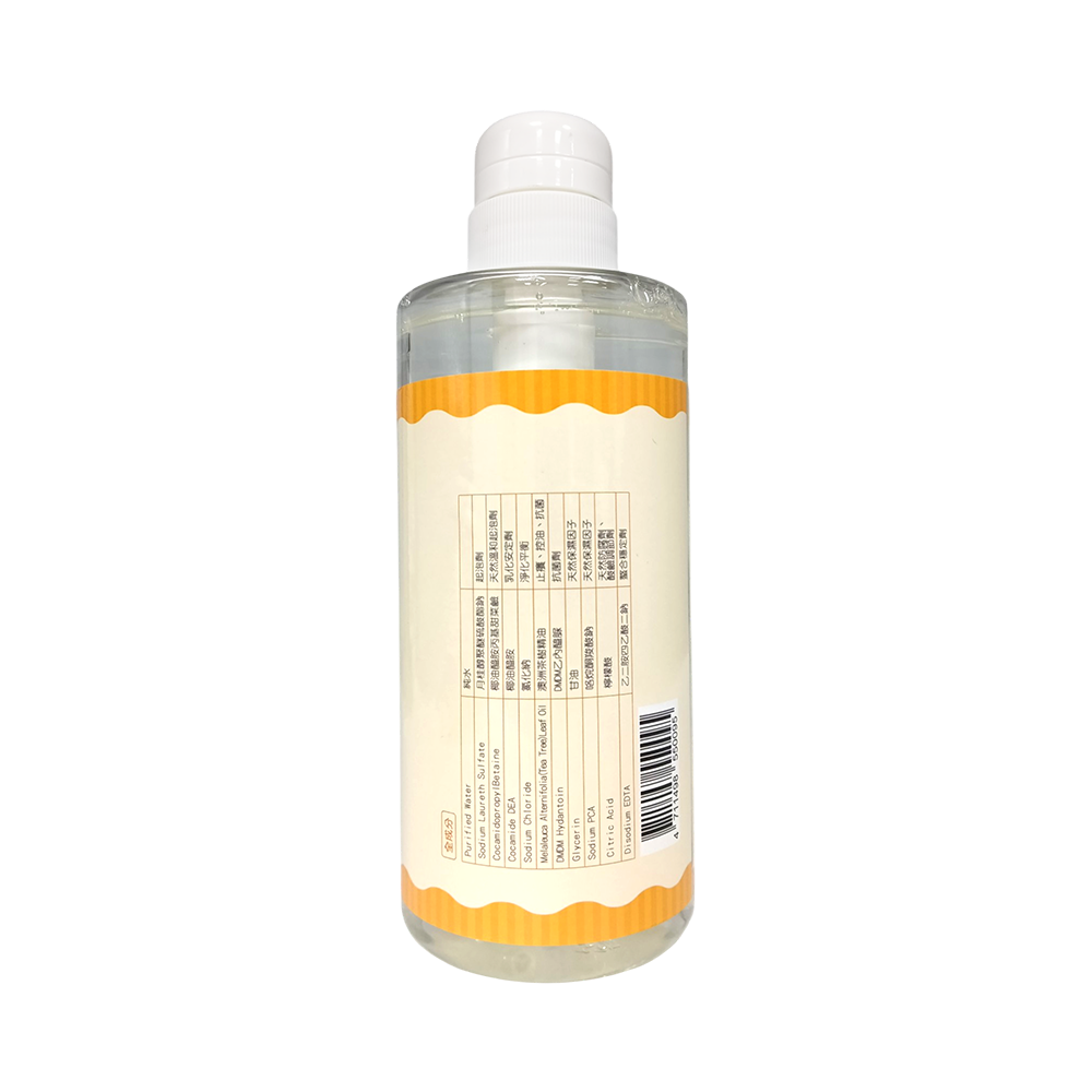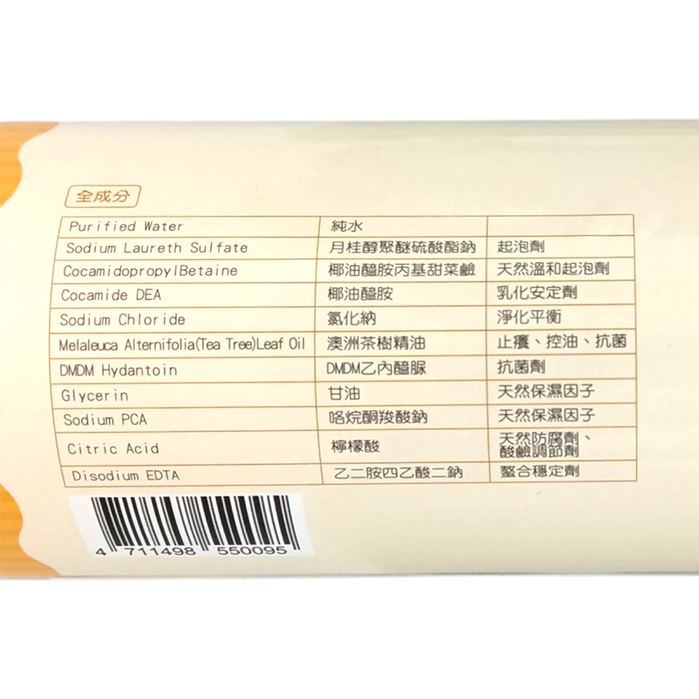 Sulfate / 月桂醇聚醚硫酸酯鈉 ,Cocamidopropyl Betaine / 椰油醯胺丙基甜菜鹼,Cocoamide DEA / 椰油醯胺, Sodium Chloride / 氯化钠,Melaleuca Alternifolia (Tea Tree) Leaf Oil / 澳洲茶樹精油, DMDM Hydantoin / DMDM乙內醯脲,Glycerin / 甘油,Sodium PCA / 保濕因子, Citric Acid / 檸檬酸, Disodium EDTA / 乙二胺四乙酸二鈉