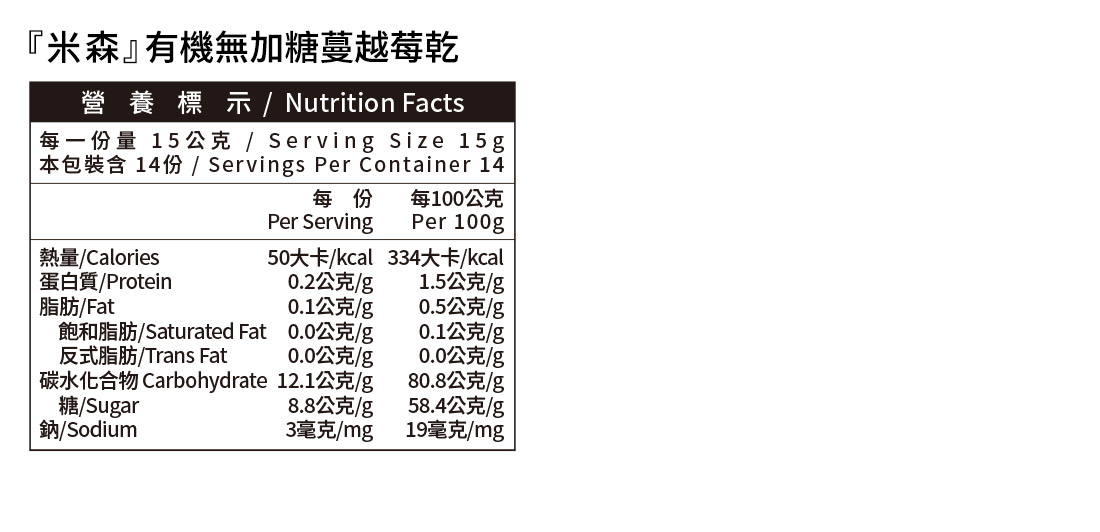 【米森】有機無加糖蔓越莓乾(210g/包)
