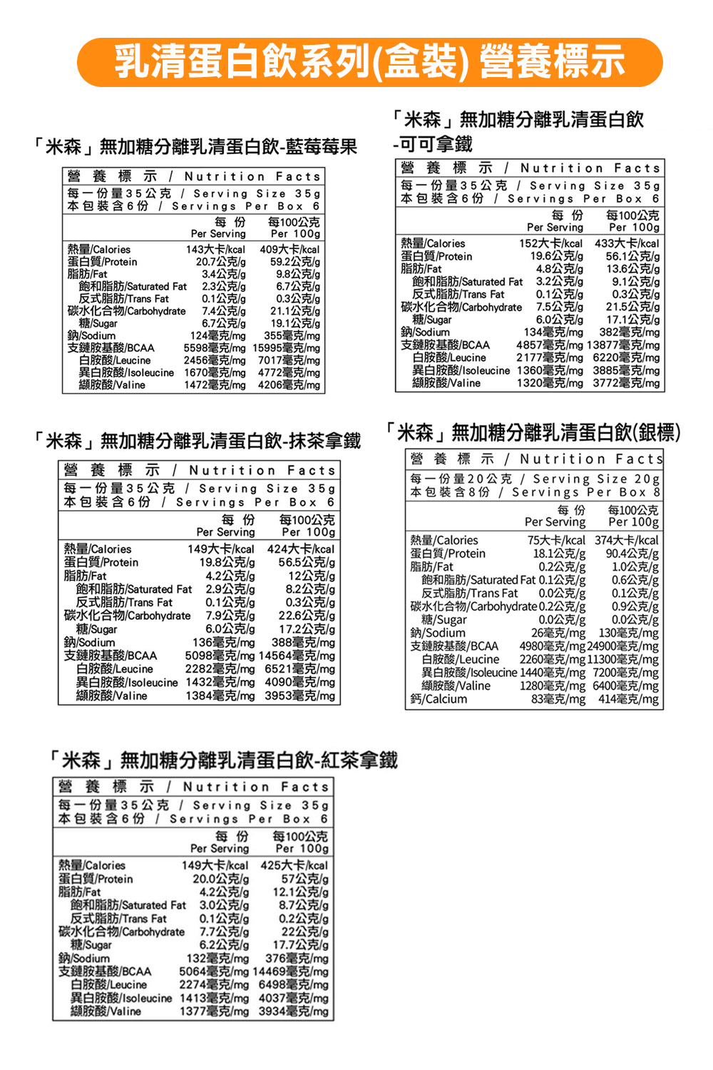 分離乳清蛋白粉(分離乳清蛋白粉、葵花卵磷脂)、全脂奶粉、錫蘭紅茶