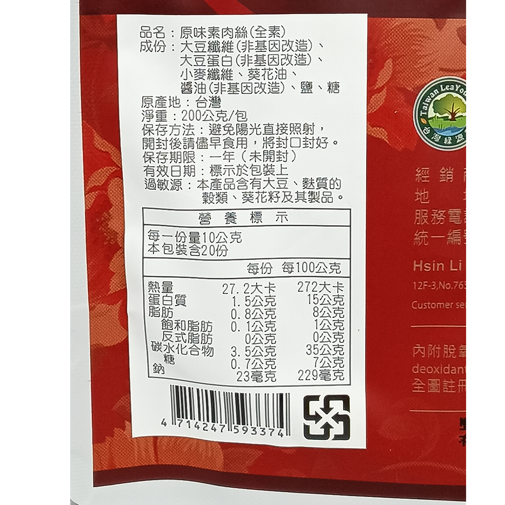 品名:原味素肉絲(全素)