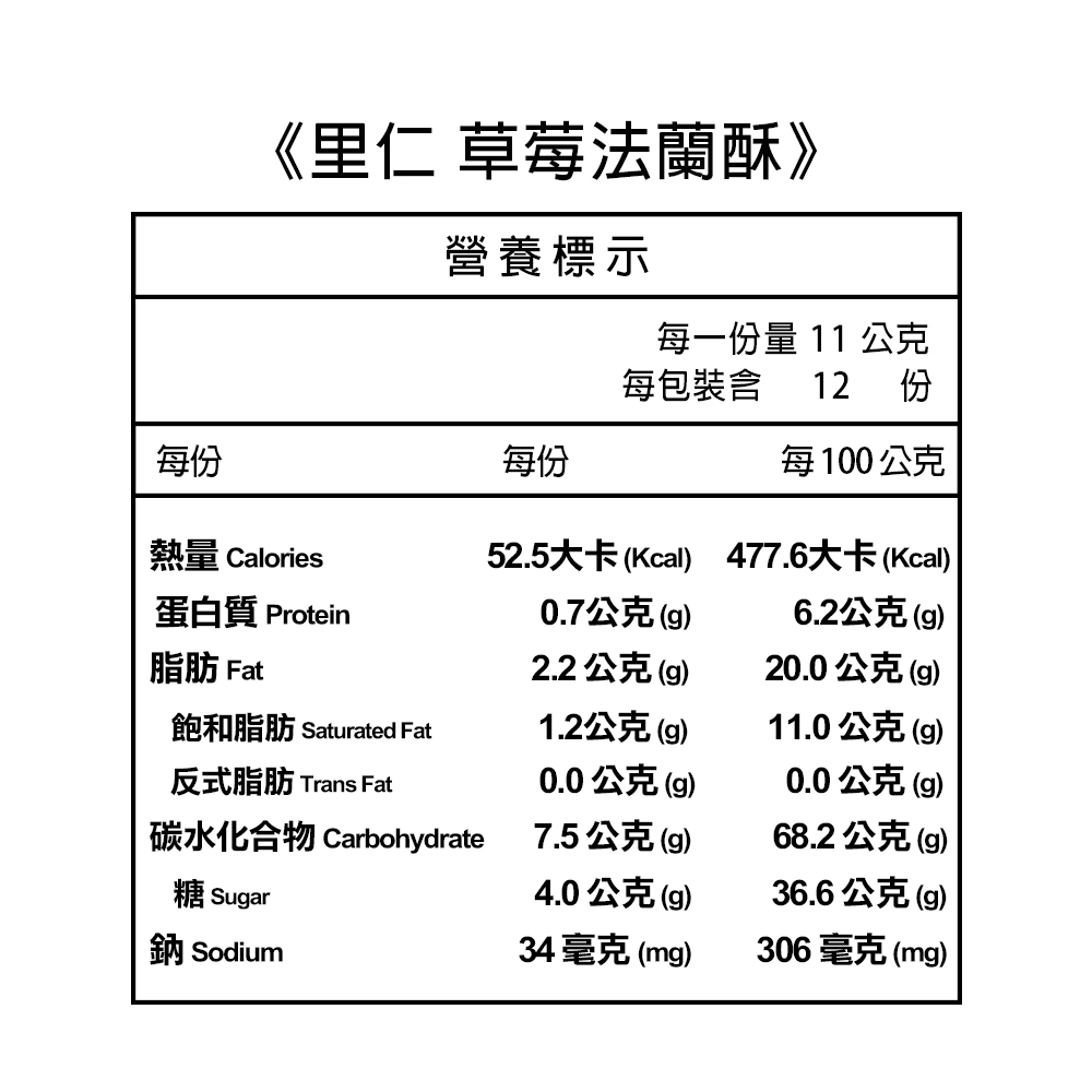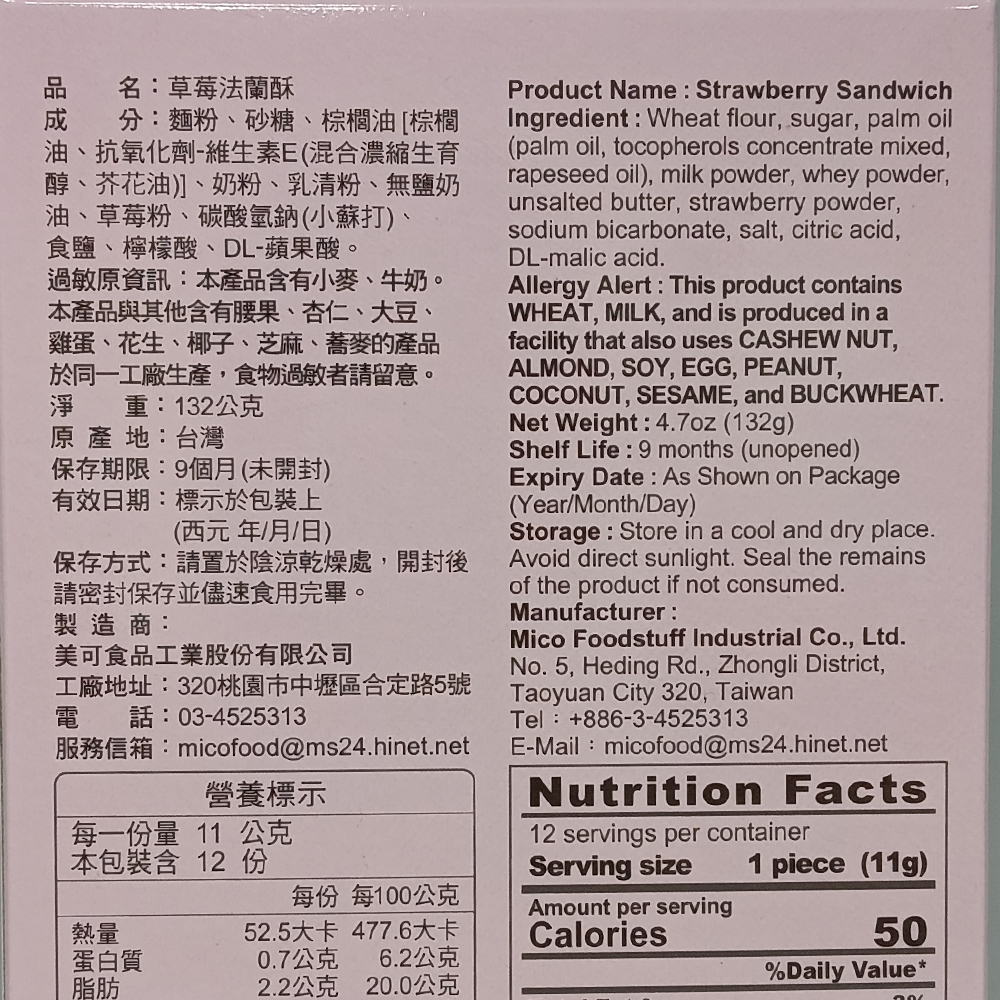 成分:麵粉,砂糖,棕櫚油[棕櫚油,抗氧化劑-維生素E(混合濃縮生育醇,芥花油)],奶粉,乳清粉,無鹽奶油,草莓粉,碳酸氫鈉(小蘇打),食鹽、DL-蘋果酸,檸檬酸