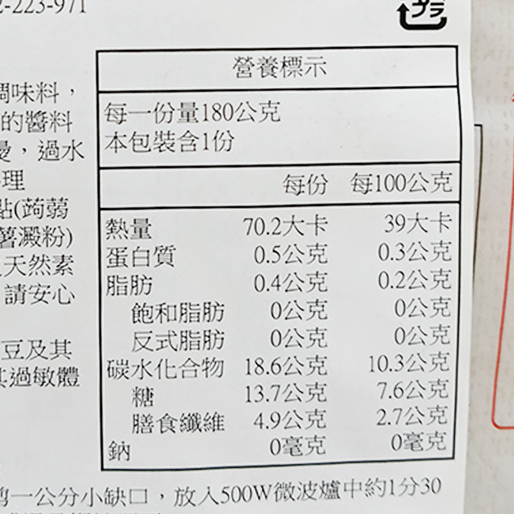 成分:日本蒟蒻、大豆粉、加工澱粉(樹薯粉、糊化澱粉)氫氧化鈣(凝固用)