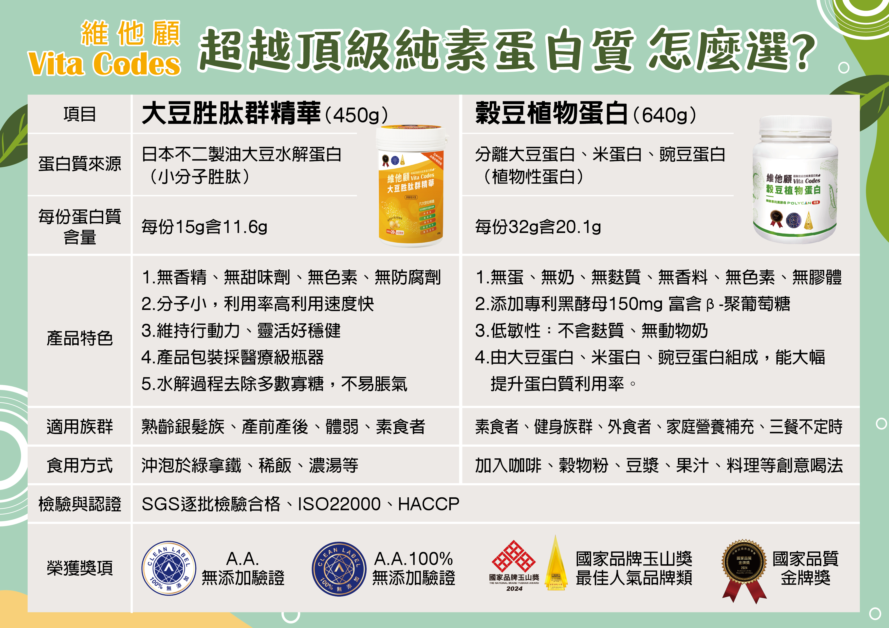 維他顧-超越頂級的純素蛋白質品牌,維他顧大豆胜肽群精華,嚴選非基改大豆原料,大豆胜肽來自日本不二製油,最高含量達20%,快速補充優質蛋白質。健康類暢銷書作家陳月卿推薦